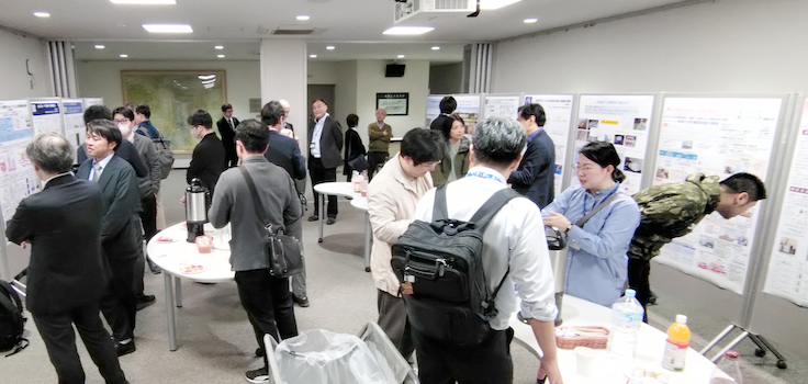 情報交換会で研究紹介ポスターを前に意見を交わす参加者